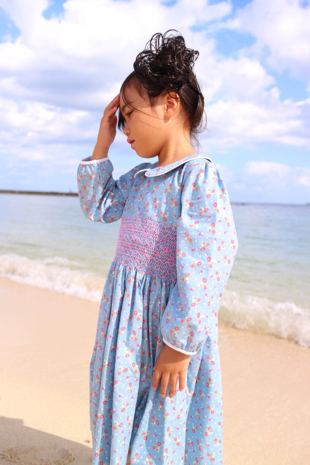 刺繍はフランス統治の影響を受けた本場ベトナムより職人が手作りした丁寧なスモッキングワンピースです。